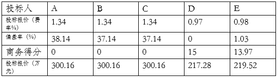案例二:某工程监理项目,估算投资总额22400万元,共有五家企业报名并按时递交了投标文件,开标如期进行。根据招标文件,评标办法采用综合评估打分法,技术部分满分70分,商务报价满分15分,企业资信满分15分。商务部分打分办法:以最低报价费率为满分15分,其余费率与最低费率相比较(差值)每增加1%扣1分,分数扣完为止。